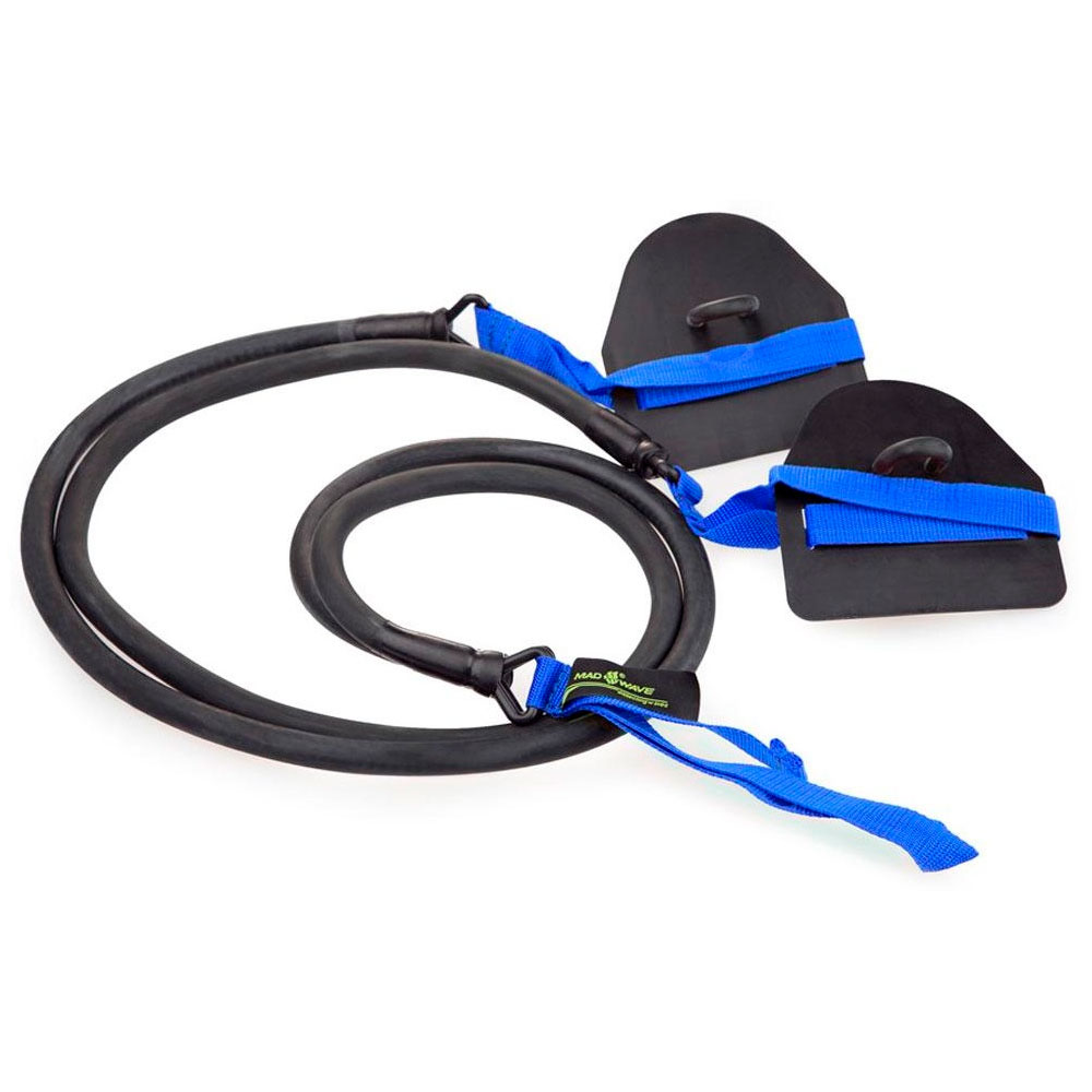 Тренажер DRY TRAINING WITH PADDLES представляет собой два латексных троса, соединенных с нейлоновой петлей, с помощью которой тренажер крепится на любой прочной (желательно металлической) конструкции, на свободных концах тросов расположены лопатки. Лопатки позволяют руке и ладони находиться в таком же положении, как и во время гребка в воде, это значительно повышает эффективность тренировок, максимально приближая занятия с тренажером к плаванию в бассейне. В процессе тренировки пловец имитирует движения, совершаемые в воде, благодаря чему замечает и исправляет ошибки, совершаемые при выполнении гребка.